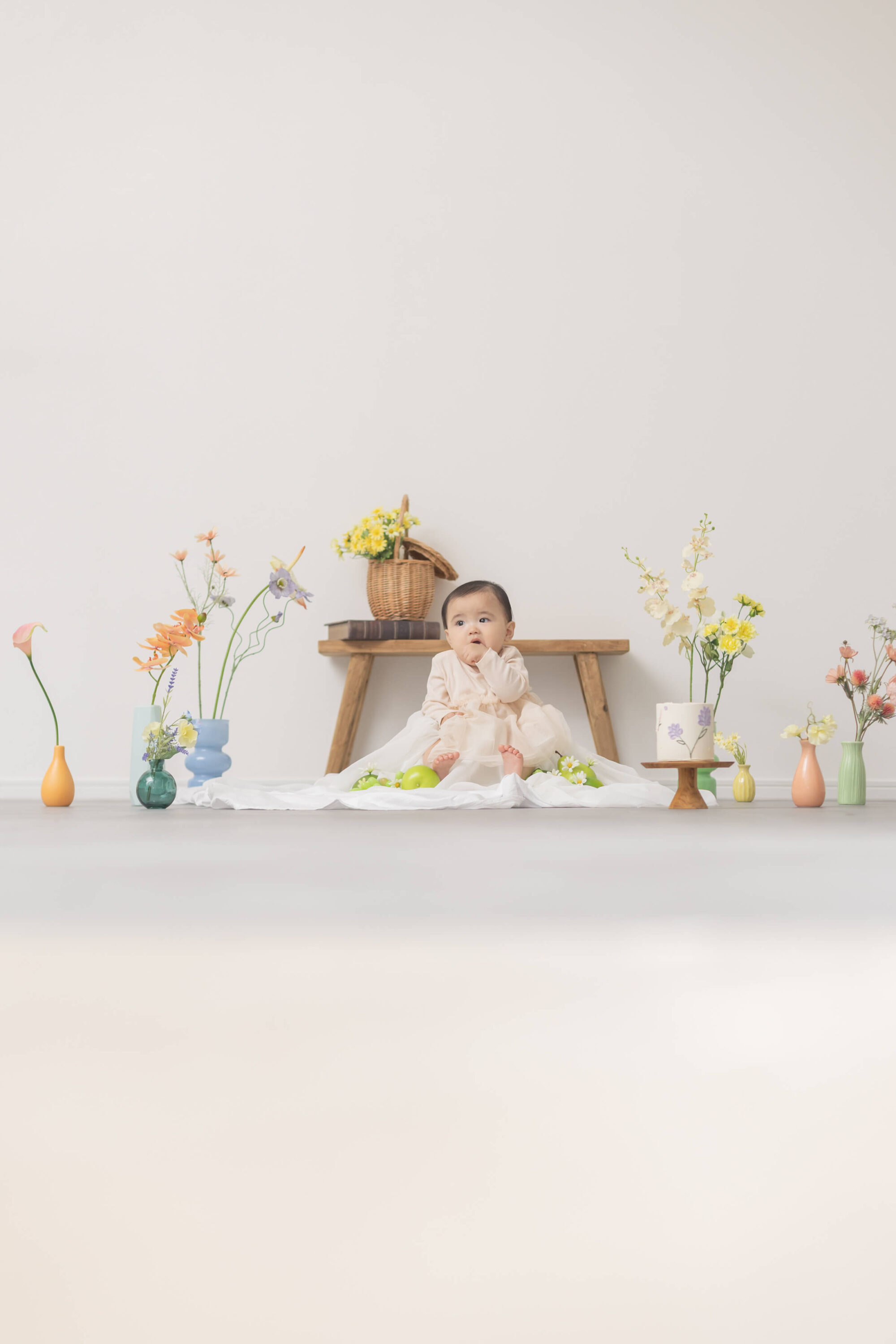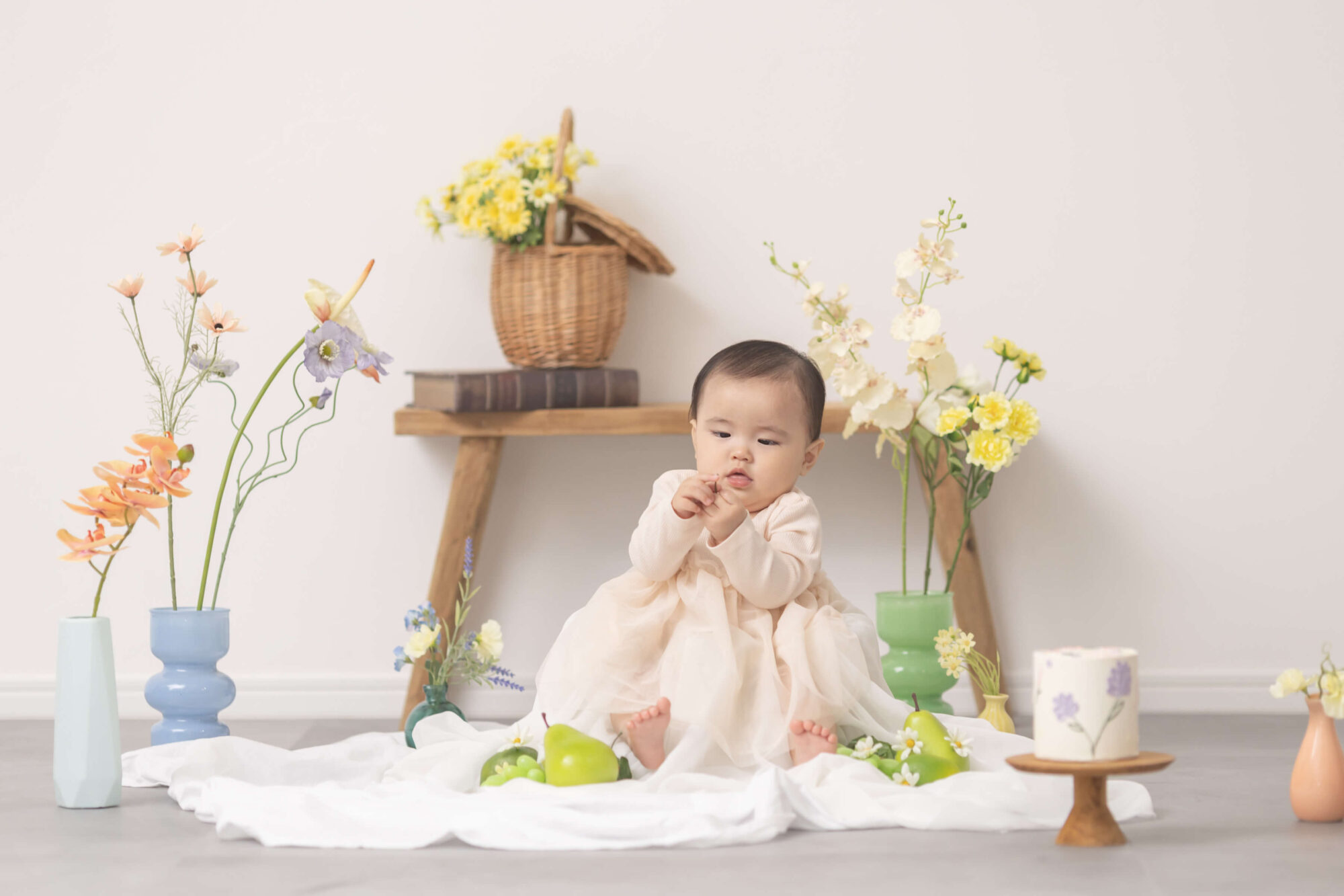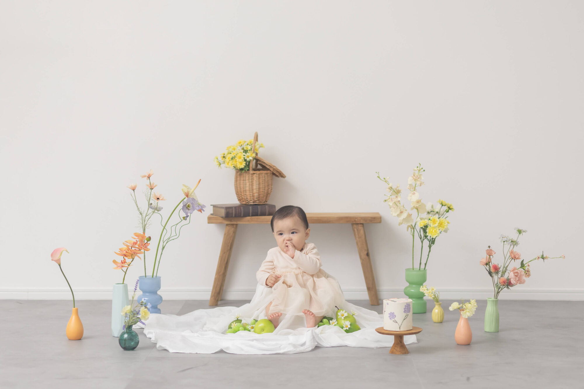 お客さまの希望を聞きながらアニバーサリーにふさわしいシーンをご提案するメゾンスタジオ北神戸。たくさんの撮影シーンから、今回はデコレーションいっぱいのハーフバースデーフォトをお届けします。時間内なら何度でもお洋服のお着替えOK!カラフルで可愛いスタジオの装飾にもぜひご注目ください!